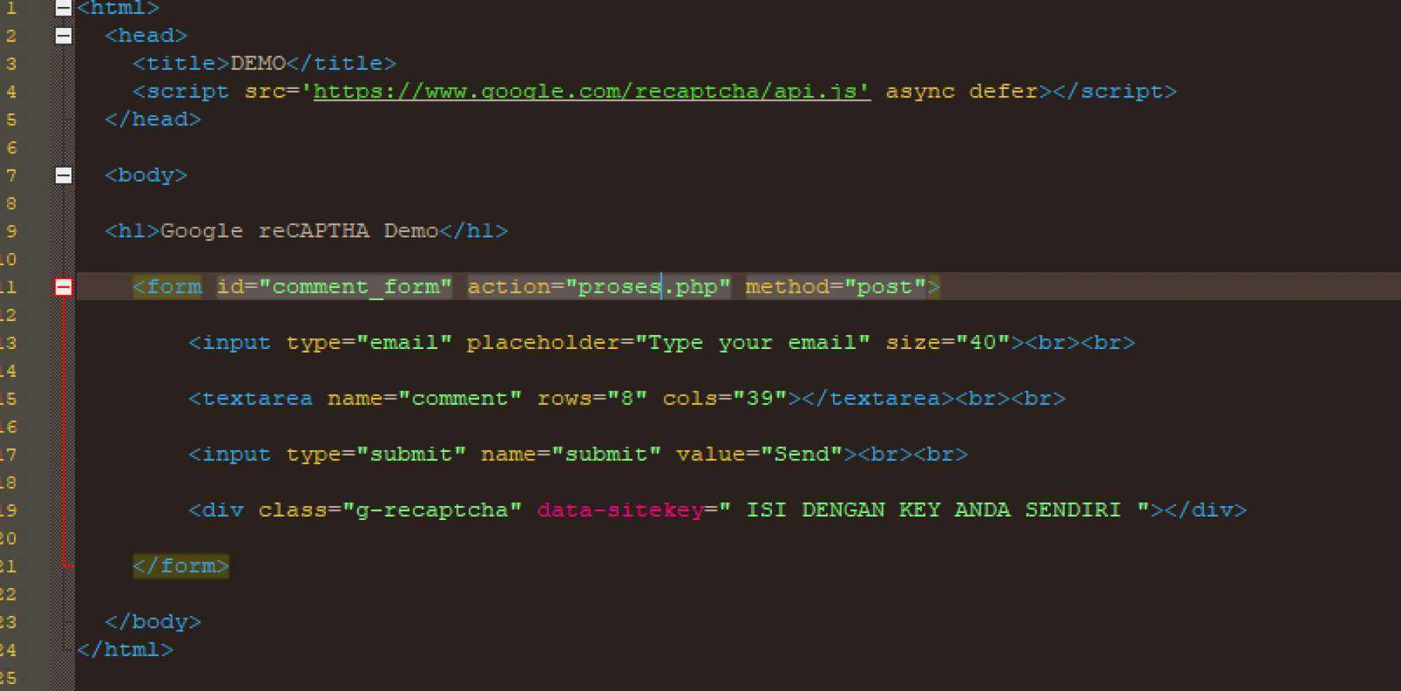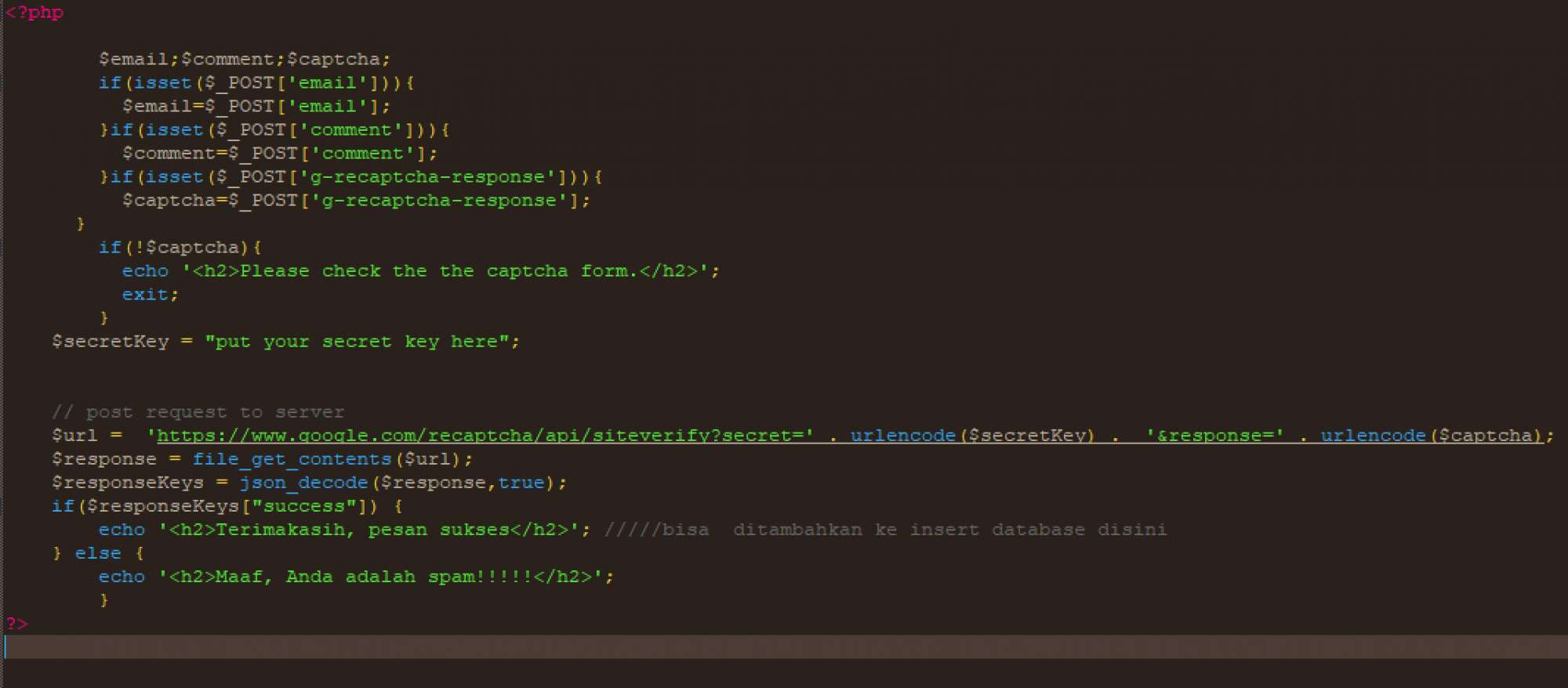 9. kemudian buat file prosesnya, saya buat proses.php, karena di form action nya dengan nama proses.php, saya buat dalam gambar agar Anda mengetik ulang dan terbiasa dengan penulisan coding. pada $secretkey isikan dengan secret key Anda yang sudah dibuat di google.