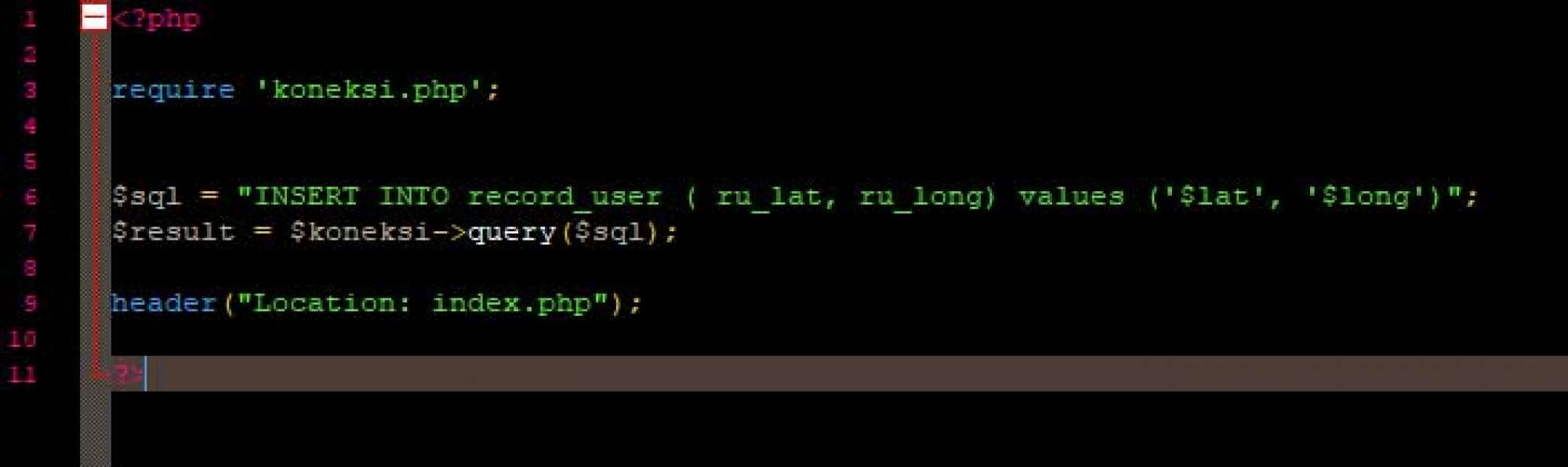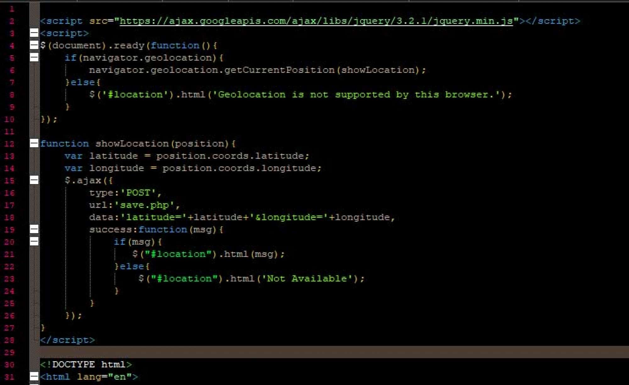 dan tambahkan codingan berikut di awal baris file index.php, disini kita akan menggunakan ajax, agar user tidak merasa di record lokasinya ke dalam database.
